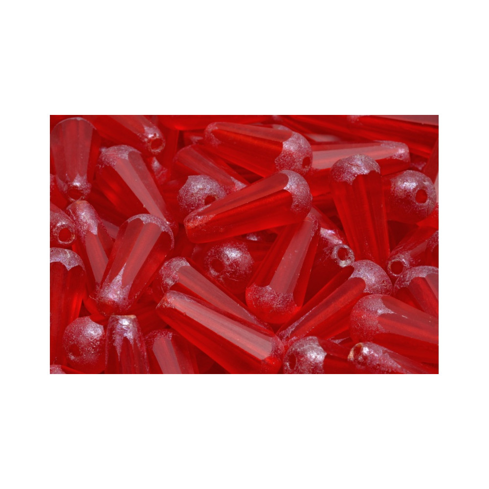 Vibrant red glass meets the precision of hand-pressed techniques in these striking firepolished drop beads. Showcasing the centuries-old tradition of North Bohemian glassmaking, each bead is a testament to the artistry of the Rutkovsky family. The deep red hue is beautifully faceted to catch the light, while the etched finish at the top provides a subtle, frosted contrast that adds a sophisticated layer of texture to your handmade jewelry designs.