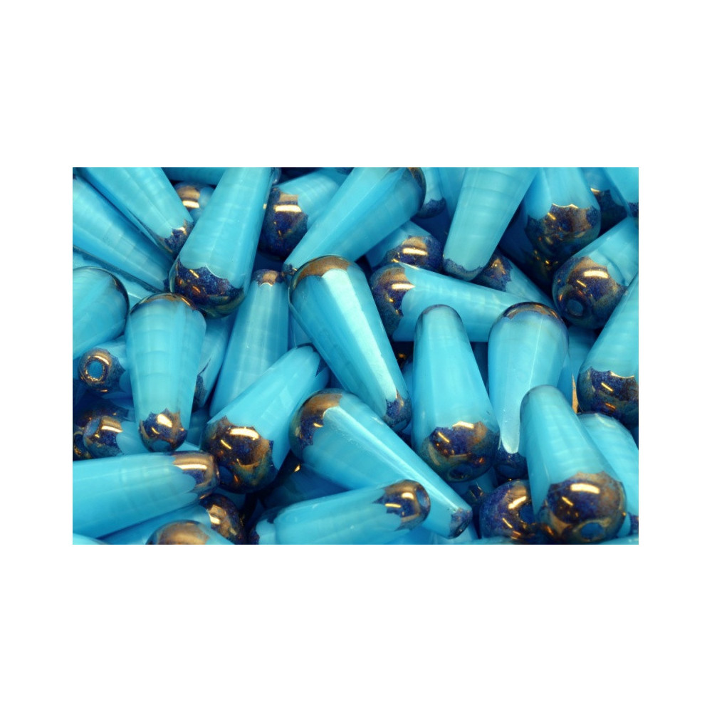 Vibrant turquoise hues blend with a rustic metallic finish on these elongated teardrops, creating an artisanal look that mimics the appearance of weathered stone or ancient sea glass. Selecting a turquoise focal point for your designs adds an immediate sense of bohemian flair, as the firepolished drop beads catch the light with their faceted surfaces while maintaining a smooth, elegant silhouette.
