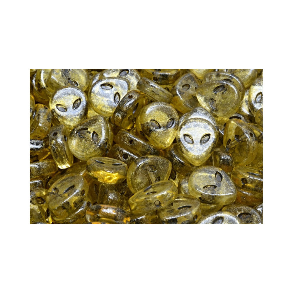 Gold-toned transparent glass combined with a dark metallic wash in the recessed eyes gives these unique alien head beads a mysterious, vintage-inspired look. The subtle shimmer of the Czech glass catches the light beautifully, making them an excellent choice for handmade bracelets or as accent charms in celestial-themed necklaces. Their translucent nature adds depth to your patterns, especially when layered with opaque seed beads.