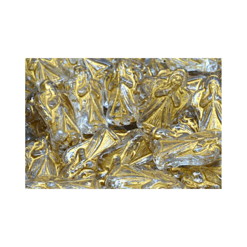 Crystal clear glass meets shimmering metallic highlights in these intricately pressed pieces, capturing a sense of celestial elegance. These Angel Beads 23 x 13 mm are produced in the heart of North Bohemia, where the Rutkovsky family continues a centuries-old lineage of glassmaking. The delicate detail of the angel's form is enhanced by a rich gold wash in the recessed areas, making each bead a testament to traditional Czech glassmaking heritage and meticulous hand-pressing techniques.