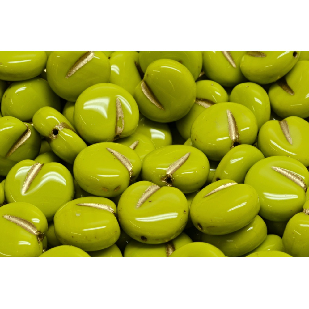 Lime green glass forms the luscious body of these handmade Czech glass pieces, while a subtle metallic wash highlights the signature apple indentation. This contrast between the glossy surface and the gold-toned accent adds a sophisticated dimension to the Rutkovsky mold. Because each bead is hand-pressed, the unique character of the glass reflects the rich traditional Czech glassmaking heritage found only in small family workshops.