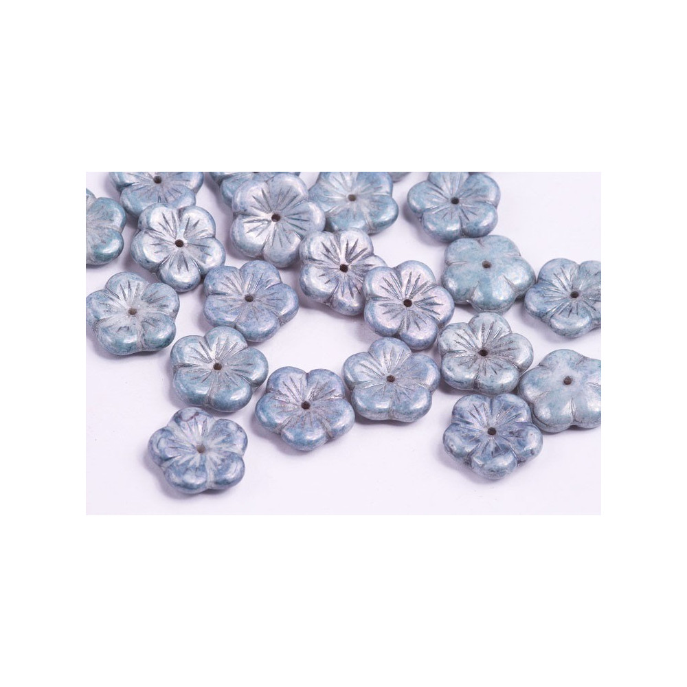 White Alabaster Blue Luster glass creates a stunning visual depth, combining a milky, semi-opaque base with a shimmering surface finish. This specific blue luster coating catches the light from every angle, highlighting the dimensional grooves of the petals and giving these Czech glass flowers a vintage, ceramic-like appearance that pairs beautifully with antique metals or modern silver components.