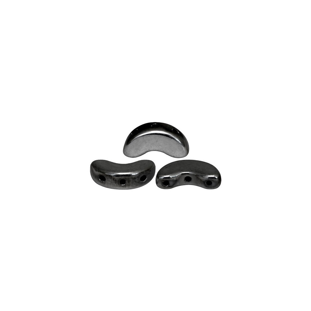 Metallic hematite finishes offer a bold, industrial edge to elegant beadwork, making them a staple for modern accessory designs. These 5 x 10 mm arch-shaped beads are specifically engineered to function as a decorative frame for a Cabochon® par Puca®, creating a stable and stylish bezel effect that mimics high-end metalwork. Because they are manufactured in the Czech Republic using traditional glass-pressing techniques, you can rely on the consistency of the holes, allowing for multiple thread passes through the bead when using specialized S-lon FIRE or N-series nylon threads.