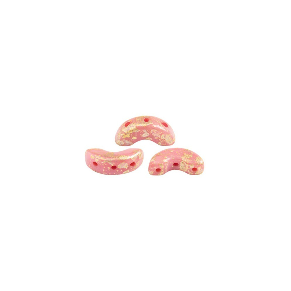 Soft rose pink tones meet luxurious gold flecks in these designer components, perfect for sophisticated jewelry palettes. Arcos® par Puca® are distinct 3-hole crescent beads crafted from premium Czech glass, specifically engineered to nestle perfectly with other shapes like Samos® par Puca® for intricate geometric patterns. The unique Opaque Rose Splash finish adds a vintage-inspired charm to any project, embodying the French chic style of designer Annick Puca.