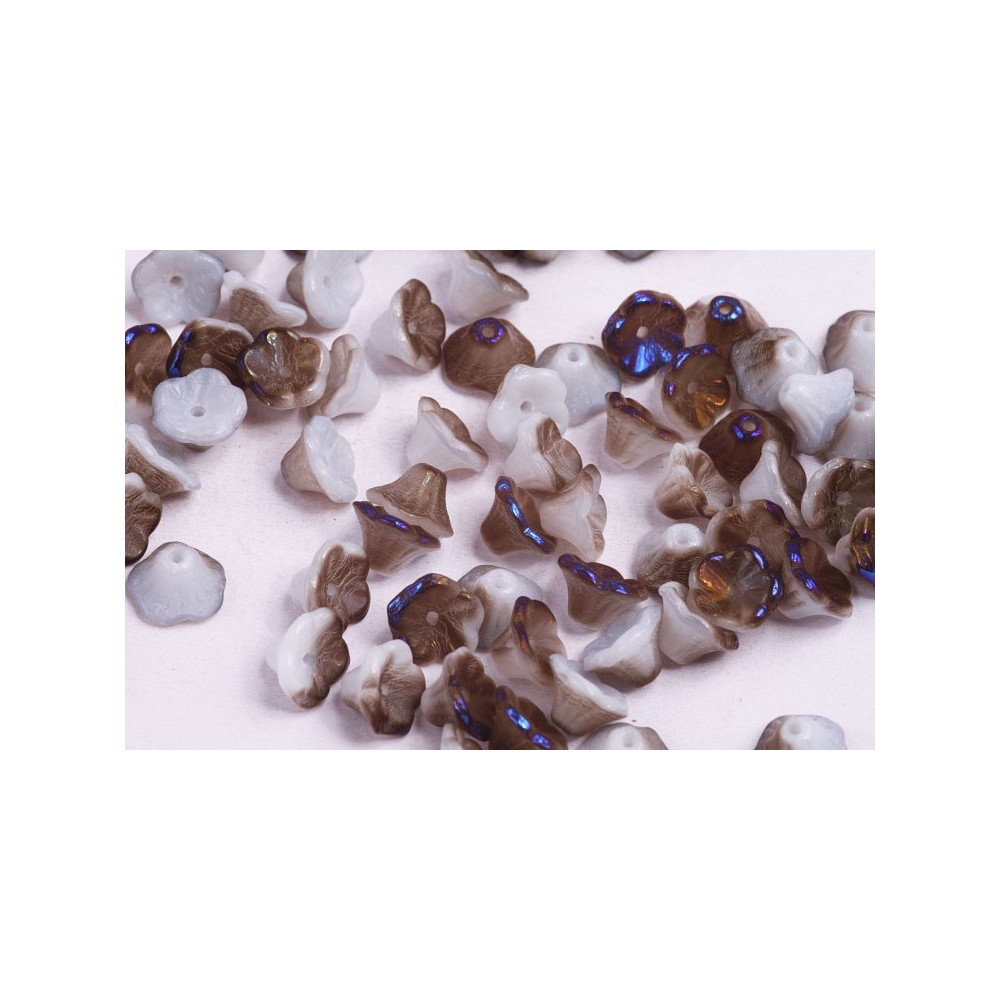 White Alabaster Azuro finish provides a sophisticated, multi-tonal appearance on these Bell Flower Cup Beads 7 x 5 mm. The base material is a premium milky white glass, which has been enhanced with a smoky brown wash and a striking metallic blue iridescent luster. This combination creates a vintage, organic look that mimics the natural variations found in woodland blossoms.