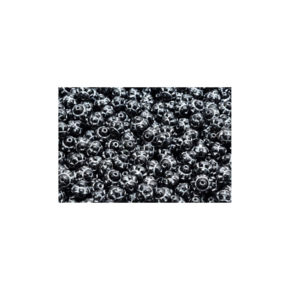 Black glass serves as the foundation for these intricately designed components, featuring a distinct white wash that accentuates the recessed geometric patterns. These Spinner Beads are manufactured using traditional Czech techniques by the Rutkovsky family, ensuring each piece possesses a consistent weight and artisan quality. The high-contrast finish provides a vintage aesthetic, making them ideal for professional designers seeking historical accuracy in their beadwork projects.