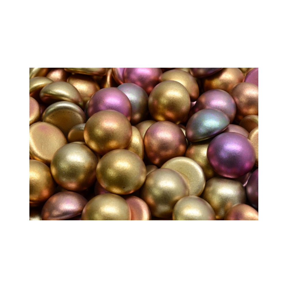 Soft metallic tones meet the timeless quality of handmade Czech glass in these stunning 12 mm Cabochon Beads. Produced by the renowned Rutkovsky family, each stone features a smooth, domed surface with a gorgeous iridescent finish that shifts between warm gold and soft mauve. Because they are hand-pressed using traditional techniques, they offer a depth of color and a metallic luster that mass-produced alternatives simply cannot match.