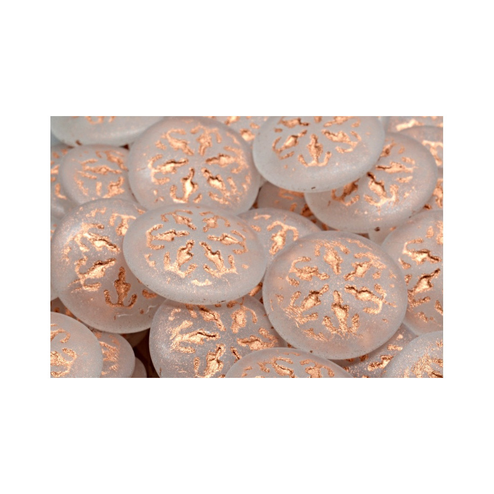 Frosted glass textures meet shimmering metallic accents in this exquisite piece of Czech craftsmanship. Imagine a winter-themed statement necklace or a bohemian-inspired cuff where this 21 mm focal point takes center stage. The delicate snowflake motif, pressed with precision, reflects a warm copper glow against the matte, stone-like surface, making these Cabochon Beads a must-have for seasonal collections.