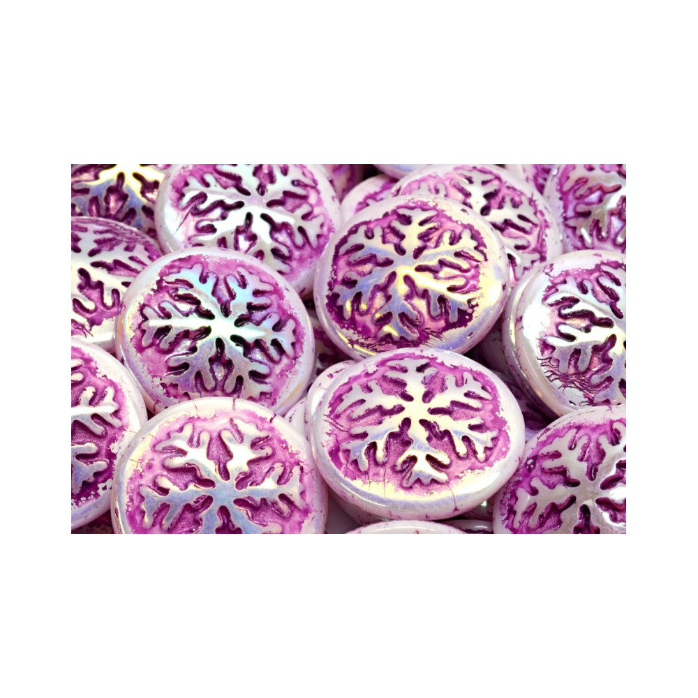 A winter-themed statement pendant comes to life when you center your bead embroidery around these stunning Snowflake Cabochon Beads. The intricate, hand-pressed snowflake design is accentuated by a vibrant fuchsia pink wash that settles into the deep grooves, creating a striking contrast against the shimmering pearlescent white surface. These 21 mm beads serve as the perfect focal point for elaborate neck collars or festive brooch designs, offering a touch of traditional Czech glassmaking heritage to your artisan collection.