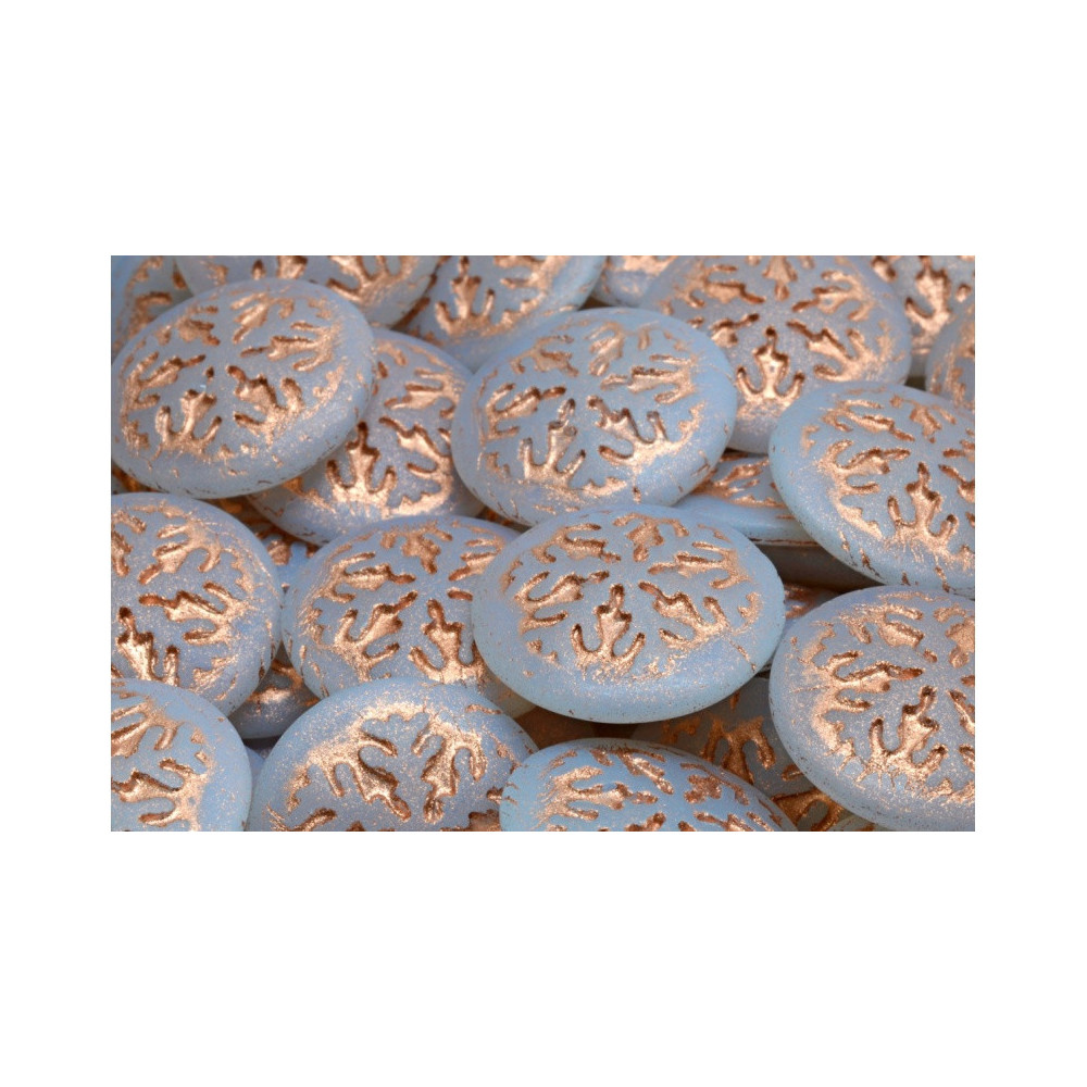 Icy winter landscapes come to life in this exquisite handmade Czech glass focal piece. These Cabochon Beads feature a delicate snowflake motif meticulously pressed into an opal light blue base, with the recessed details enhanced by a rich copper metallic finish. Produced by the Rutkovsky family, these pieces carry the legacy of traditional Czech glassmaking heritage, ensuring that every 21 mm cabochon possesses its own unique character and artisanal depth.