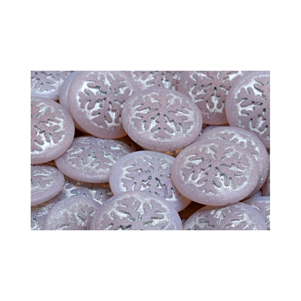 Soft pink hues and shimmering silver accents define these premium Cabochon Beads, showcasing the mastery of traditional Czech glassmaking heritage. Each piece is hand-pressed using unique bead molds that have been refined through generations of family tradition at the Rutkovsky workshop. The 21 mm diameter provides a substantial surface area for the intricate snowflake relief, while the precisely calibrated flat back ensures a seamless fit for bezel setting or advanced bead embroidery projects.