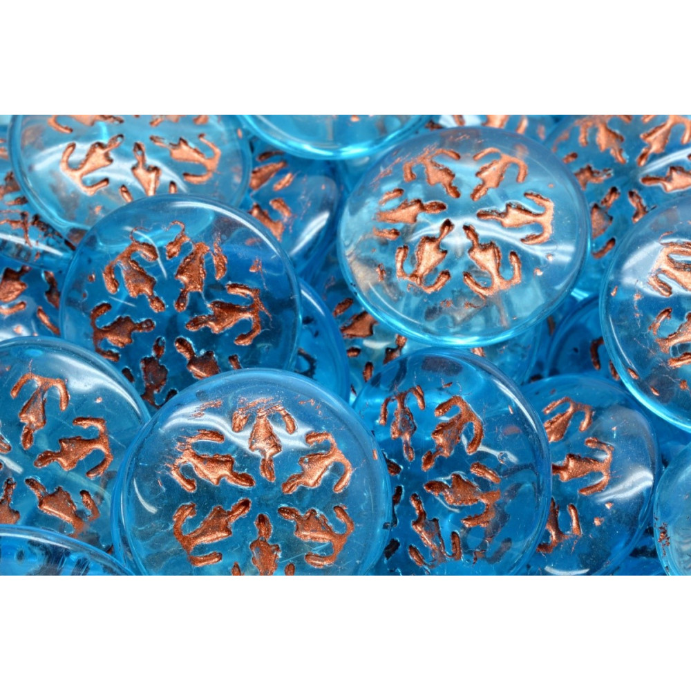 Winter-inspired designs and celestial themes come to life with this unique aqua and copper combination. The contrast between the translucent blue base and the earthy surface treatment ensures that each piece stands out. Whether used in high-end costume jewelry or artisanal craft projects, these 21 mm cabochons represent a masterclass in Bohemian glass pressing.