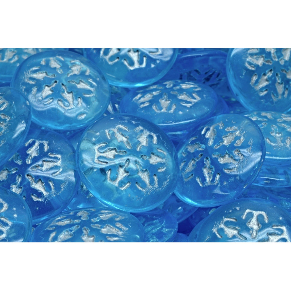 Light blue transparent glass serves as the base for a delicately pressed silver snowflake, creating a high-contrast look that mimics the frosty sparkle of real ice. Each 21 mm piece is carefully hand-pressed in the Rutkovsky family workshop, ensuring that the traditional Czech glassmaking details are preserved in every bead. These are particularly effective for bead embroidery or as central elements for wire-wrapped pendants and statement brooches.