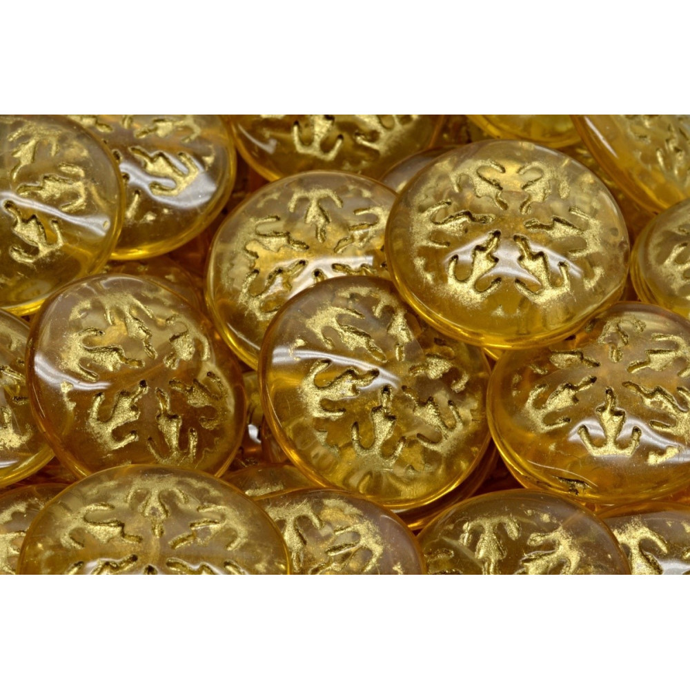 Glowingly transparent with a honey-like warmth, these Cabochon Beads showcase an intricate snowflake motif that evokes the magic of the first frost. The handmade Czech glass base is expertly pressed by the Rutkovsky family, ensuring a depth of color and clarity that reflects a centuries-old traditional Czech glassmaking heritage. Each piece features a delicate gold-wash within the etched design, providing a luxurious contrast against the amber glass and making it a perfect centerpiece for high-end jewelry making supplies.