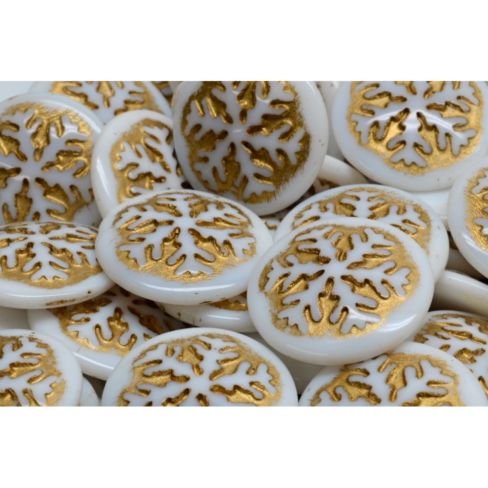 The crisp white opaque glass provides a clean, elegant backdrop for the radiant gold snowflake motif. This metallic finish is carefully applied to the recessed pattern, creating a striking contrast that catches the light beautifully. Whether you are creating a holiday brooch or a pair of festive earrings, these components add a luxurious touch of winter jewelry supplies to your kit.