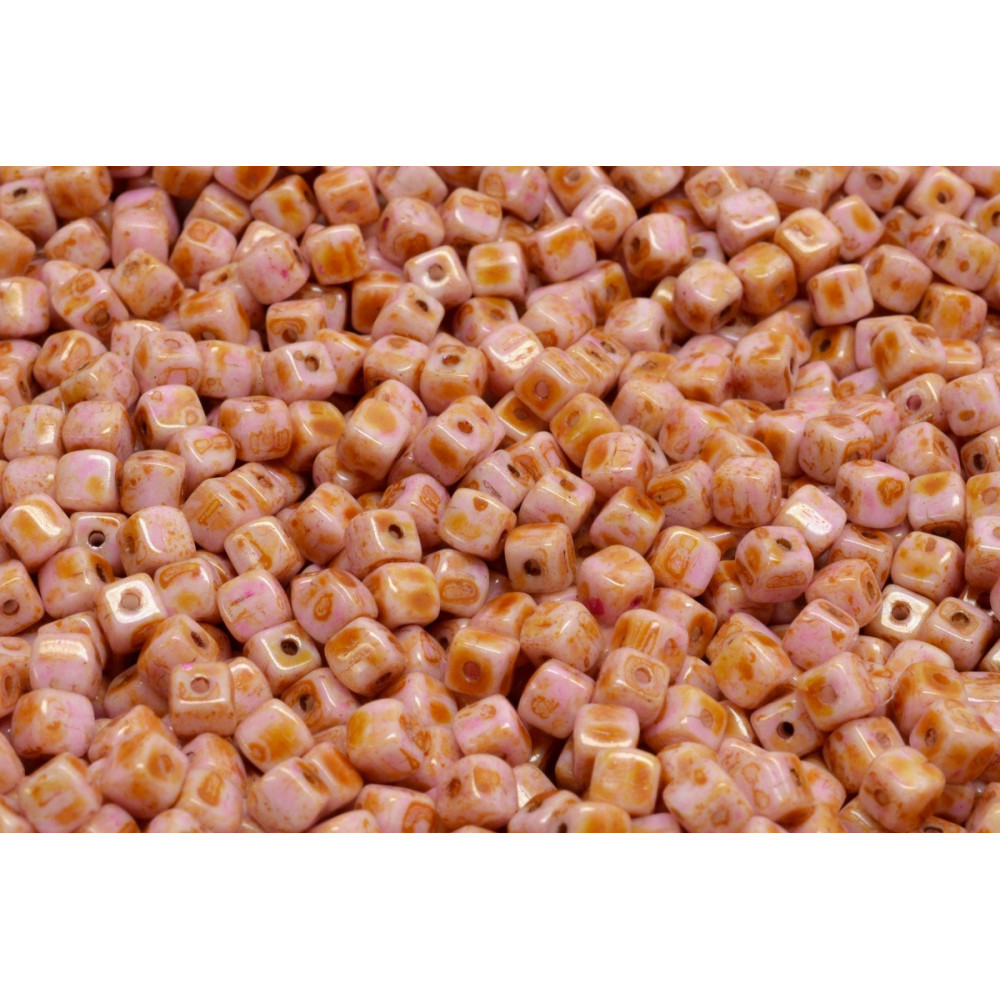 Soft pastel pink tones meet vibrant peach-orange mottling in these exquisite Cube Beads 4 x 4 mm, creating a playful yet sophisticated texture for your next project. These handmade Czech glass cubes offer a refreshing geometric alternative to round beads, providing a structural depth that catches the eye. The opaque pink spotted finish resembles natural stone or speckled candy, making them a perfect choice for boho-chic bracelets or modern minimalist necklaces where organic patterns take center stage. Because they are produced by the Rutkovsky family, each bead carries the legacy of traditional Czech glassmaking heritage, ensuring a high-quality, uniform shape that is ideal for structured beadweaving.