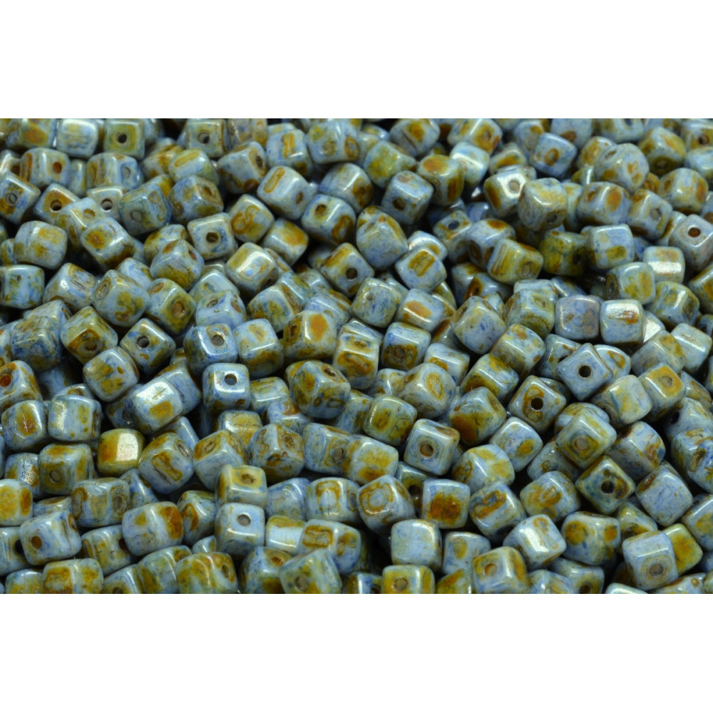 Periwinkle blue tones meet earthy, rustic accents in these versatile glass squares, making them a must-have for designers seeking a natural, weathered aesthetic. These Cube Beads 4 x 4 mm feature a distinctive spotted finish that mimics the look of semi-precious stone, lending an organic feel to geometric jewelry design. Their uniform shape and smooth handmade Czech glass surface provide excellent structural stability, whether you are building intricate mosaic beadwork patterns or looking for the perfect spacer beads to separate larger focal elements in a chunky bracelet.