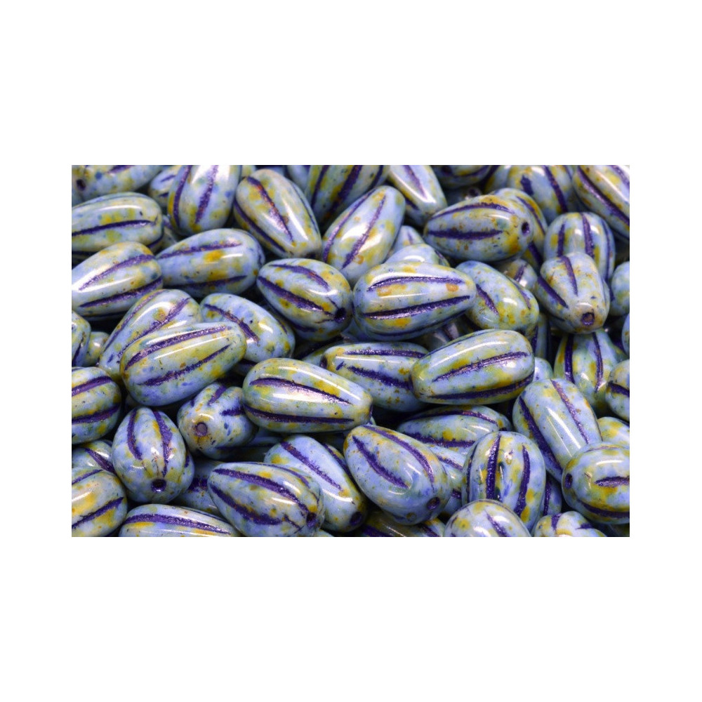 Speckled periwinkle tones and earthy ochre splashes define the unique aesthetic of these artisan Drop Melon Beads. Each piece is meticulously shaped in the Rutkovsky family workshop using traditional pressing techniques that ensure a consistent 13 x 8 mm profile. The longitudinal grooves, characteristic of the melon style, are accentuated with a deep violet pigment, creating a striking contrast that mimics the organic textures found in nature and boho-style aesthetics.