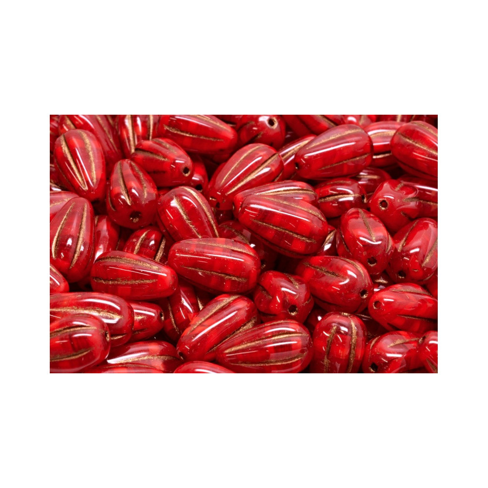 Glass artistry is at the heart of these hand-pressed treasures from the Rutkovsky family, who carry on a centuries-old tradition of Czech glassmaking heritage. Each of these Drop Melon Beads is meticulously crafted to ensure a consistent 13 x 8 mm size while maintaining the unique, artisanal feel of handmade Czech glass. The deep red transparency is beautifully contrasted by a gold-toned wash that settles into the melon-style ribbing, adding a touch of vintage luxury to the design.