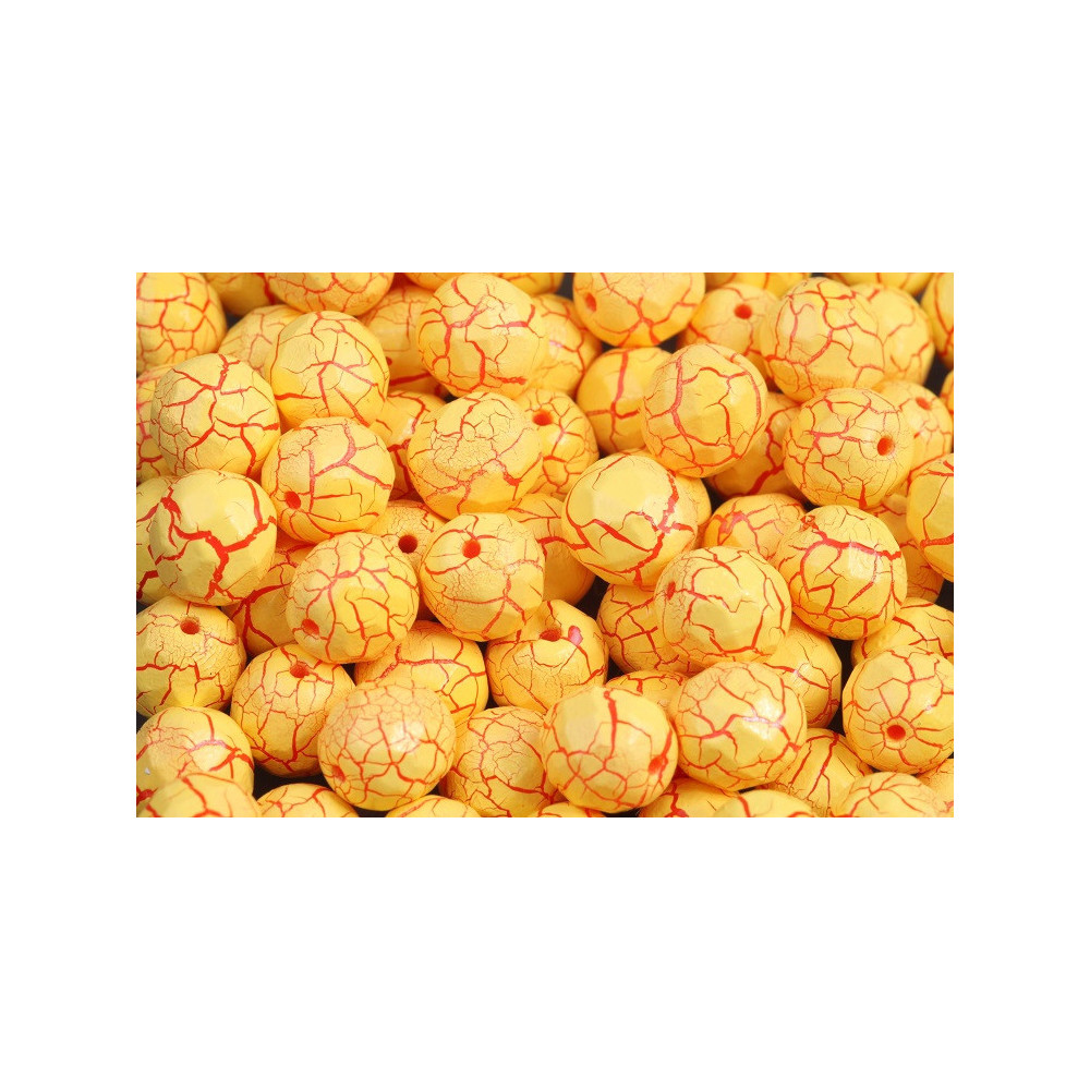 Faceted glass techniques involve machine-cutting the surface and then briefly reheating the beads to achieve a smooth, glossy finish that maintains sharp enough edges to catch the light. This specific ionic yellow/red treatment results in a unique veined appearance, giving each bead an artisanal, almost organic character that resembles natural stone while retaining the lightweight durability of Czech glass beads.
