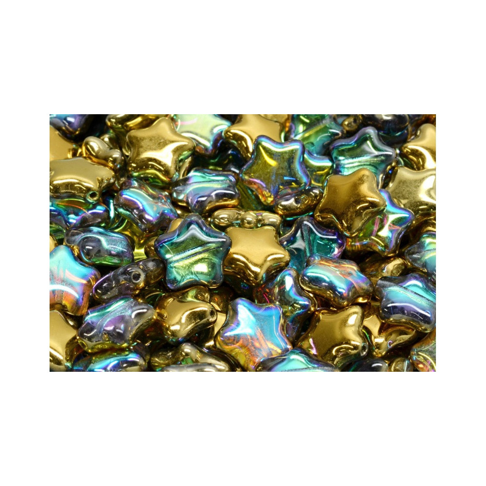 Crystal glass provides the transparent base for this Crystal Golden Rainbow finish, resulting in a Flat Star Bead that captures light from every angle. Unlike standard opaque finishes, this specific treatment allows the Rutkovsky craftsmanship to shine through, creating a depth of color that shifts between metallic gold and vibrant peacock hues. These Czech glass stars are a testament to the traditional Czech glassmaking heritage that the Rutkovsky family has preserved for generations.