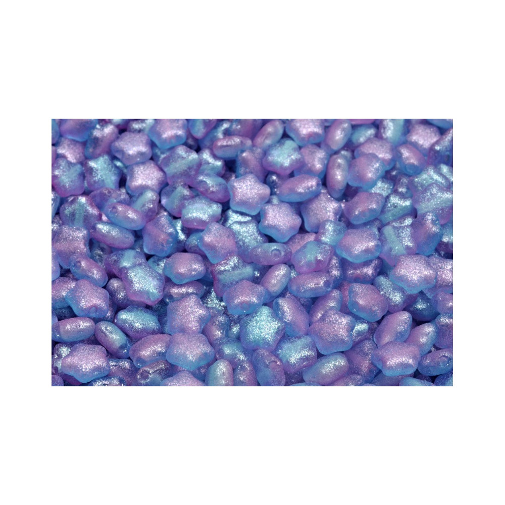 Luminous lavender and soft aqua tones blend seamlessly across the surface of these Czech glass stars, featuring a shimmering iridescent finish that captures the light from every angle. These Flat Star Beads 6 x 6 mm are produced using traditional hand-pressing techniques in the Rutkovsky family workshop, where molten glass is carefully molded into precise celestial shapes. The result is a high-quality bead with a smooth, consistent texture and a depth of color that only authentic handmade Czech glass can provide, ensuring each piece carries the weight of a long Czech glassmaking heritage.