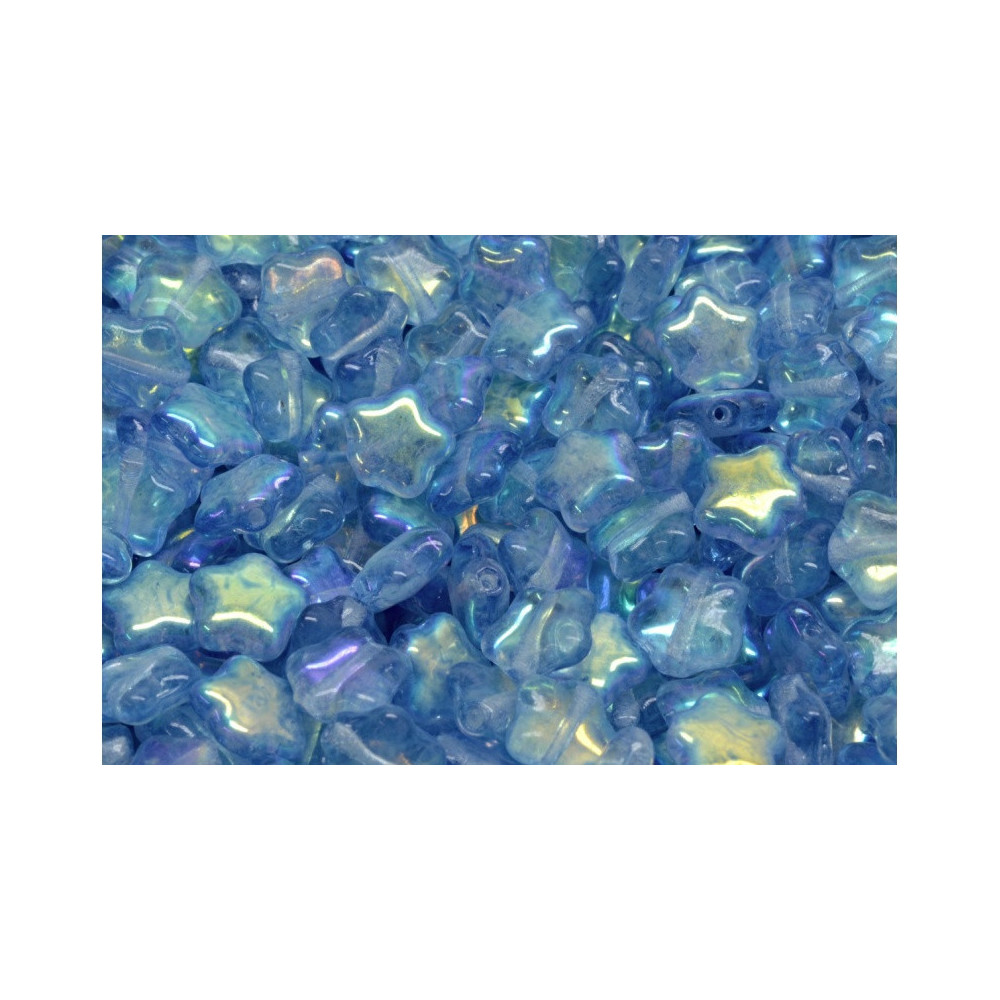 Light blue translucent glass serves as the base for these exquisite Flat Star Beads 8 x 8 mm, featuring a shimmering iridescent finish that captures the light with every movement. These hand-pressed Czech glass beads are produced using traditional molds, ensuring a consistent star silhouette with soft, rounded points that feel comfortable against the skin. The precision of the Rutkovsky family production ensures that each piece maintains its structural integrity while providing a high-gloss luster that resembles a night sky reflection.