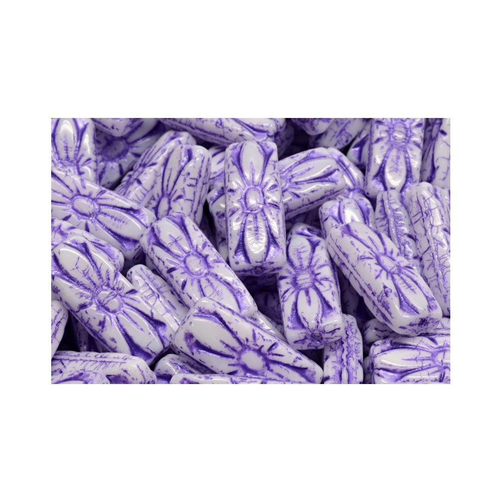Vibrant metallic violet details seep into the intricate floral engravings of an opaque white base, creating a high-contrast look that instantly draws the eye. These Flower Rectangle Beads 20 x 8 mm offer a unique elongated silhouette, perfect for designers looking to break away from traditional round shapes. The surface features a delicately pressed botanical pattern, highlighted by a shimmering finish that catches the light with every movement.