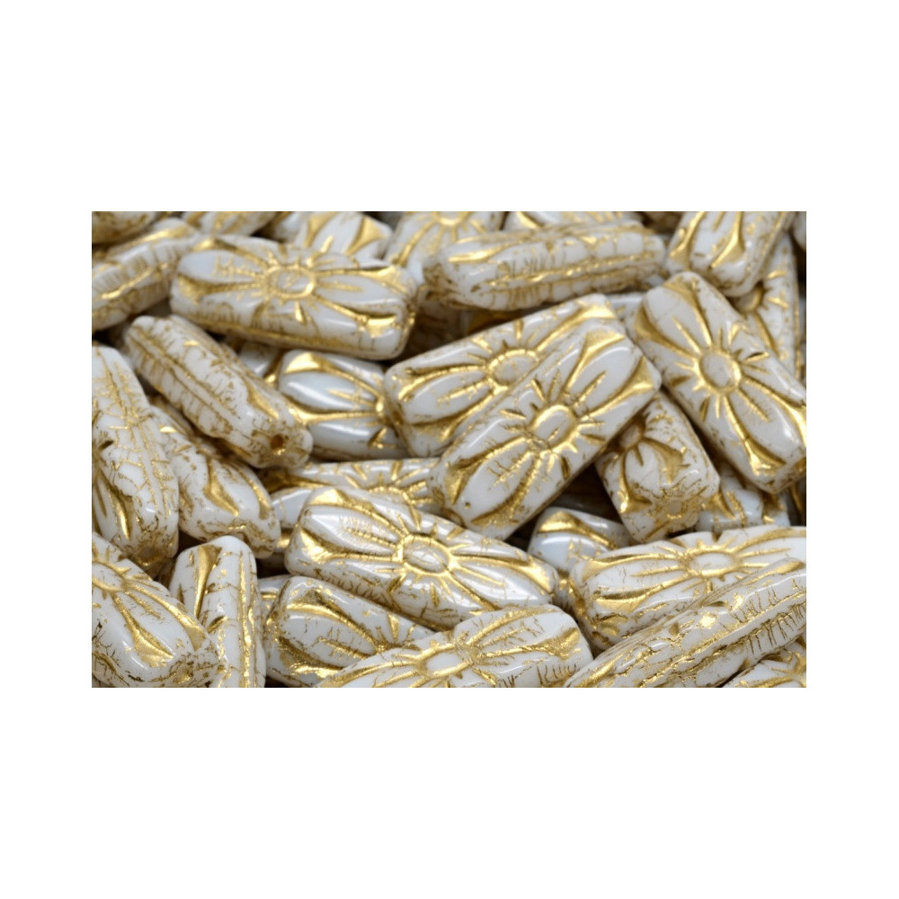 Opaque white glass serves as the sophisticated foundation for these Flower Rectangle Beads 20 x 8 mm, which feature a meticulously applied gold wash to highlight their embossed floral relief. Each piece showcases a sunburst-like motif, where the metallic finish settles into the recessed patterns to create a vintage, weathered aesthetic that is highly sought after in artisanal jewelry making. The glossy finish of the base glass provides a smooth tactile experience while offering a high-contrast background for the golden accents.