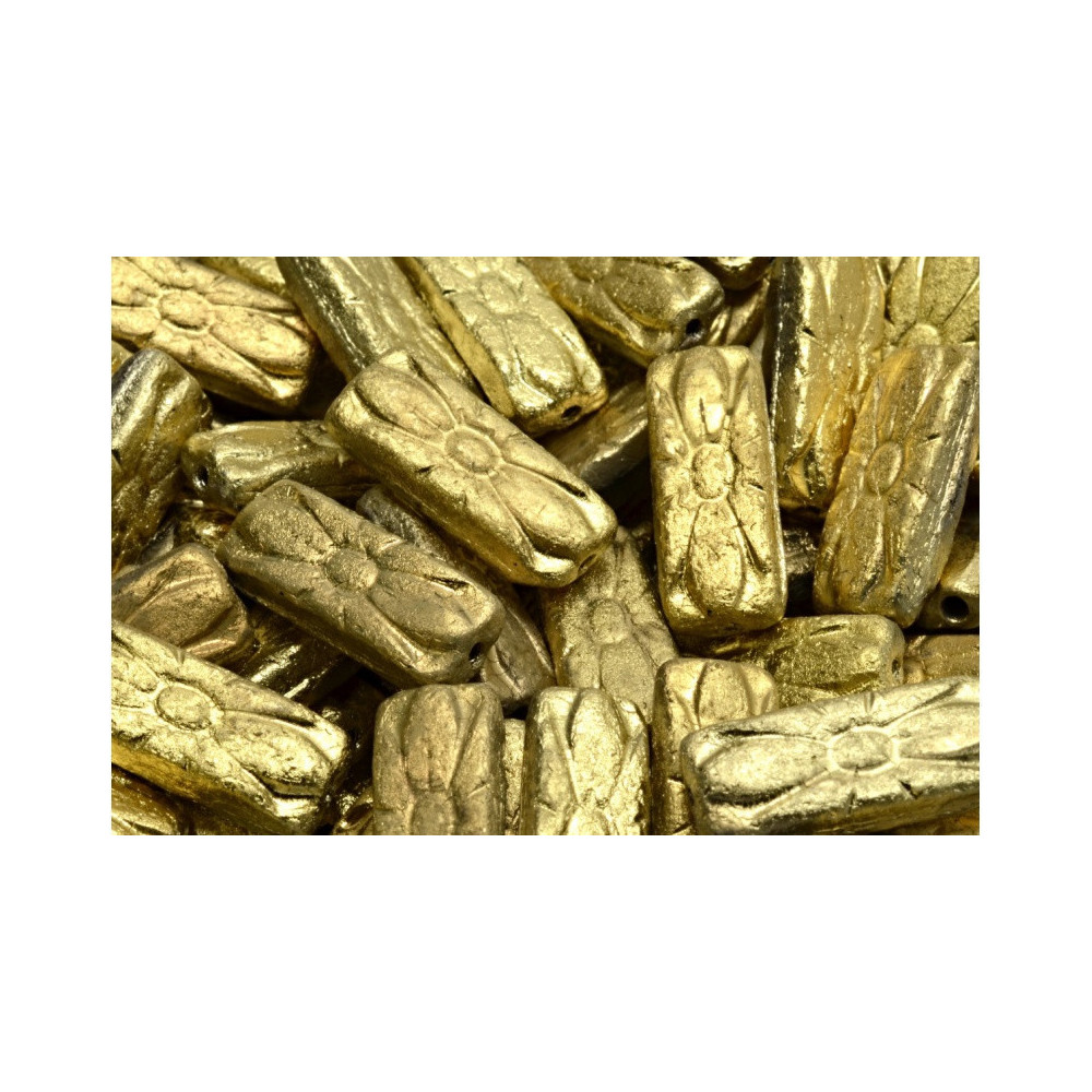 Gold-toned pressed glass provides a luxurious foundation for these intricately designed components, showcasing the heritage of Bohemian craftsmanship. These Flower Rectangle Beads 20 x 8 mm feature a double-sided embossed floral motif that evokes a sense of vintage elegance, perfect for centerpieces in earrings or focal points in bracelets. The Czech glass material ensures durability and a weighty, high-quality feel that elevates any handmade jewelry project.
