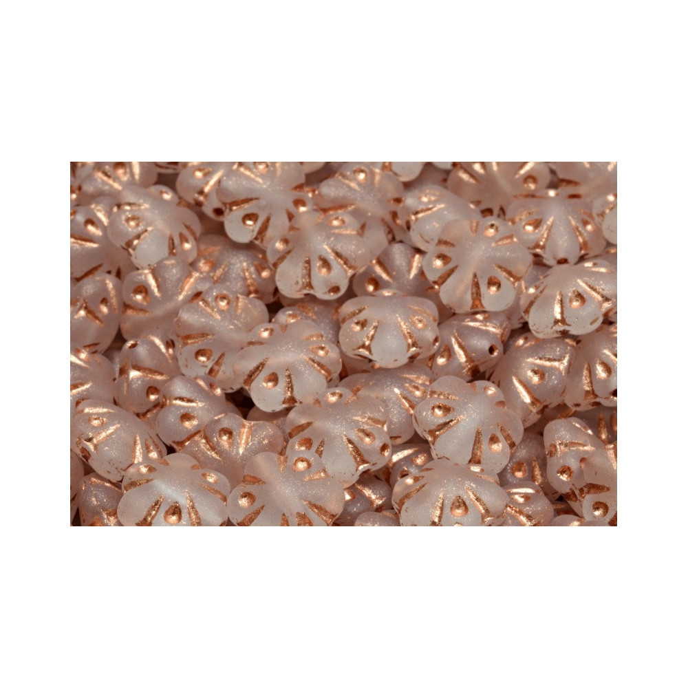 Matte textures meet metallic highlights in these Folklore Flower Beads 11 x 11 mm, produced by the world-renowned Rutkovsky factory. Each bead is expertly pressed from premium Czech glass, featuring a frosted surface that mimics the soft, weathered appearance of sea glass. This translucent base provides a sophisticated backdrop for the intricate rose gold finish that is carefully washed into the petal grooves, accentuating the botanical details. Jewelry designers often pair these floral elements with petal & leaf beads to create dimensional, garden-inspired compositions for statement necklaces or romantic earrings.
