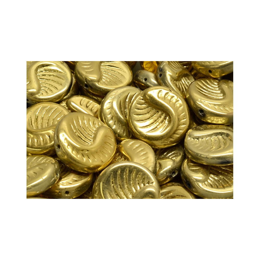 Crystal-based glass serves as the foundation for the Crystal Full Amber finish, a rich, metallic gold coating that provides a brilliant glow and exceptional light reflection. Professional designers often utilize these gold coin beads as central elements in statement necklaces, relying on the 0.8 mm hole consistency for smooth stringing on medium-weight jewelry wires or specialized cords. The finish is engineered to highlight the deep ridges of the fossil pattern, creating high-contrast highlights and shadows.