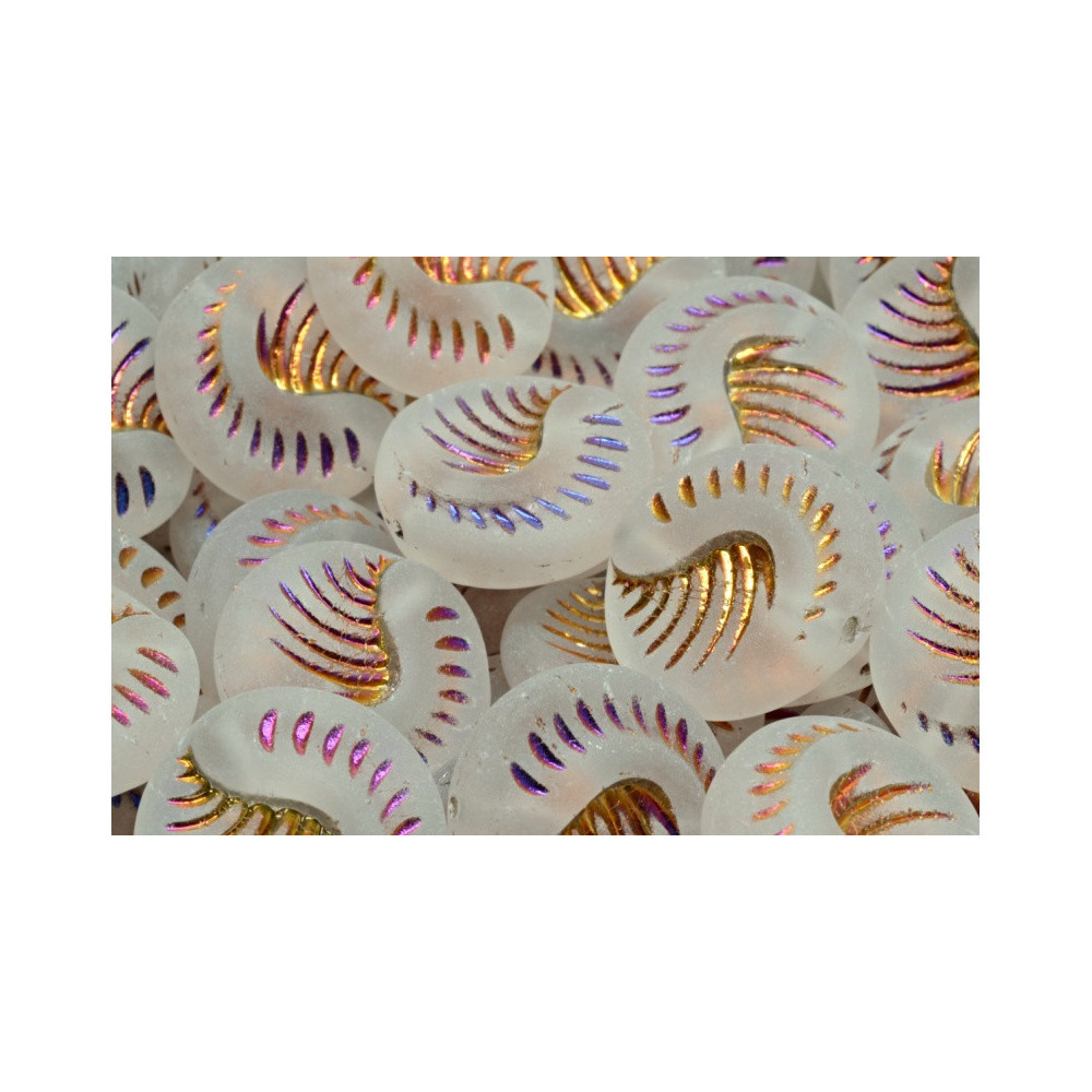 Iridescent Sliperit coating settles into the deep, etched grooves of the spiral fossil pattern, creating a striking contrast against the satin-finished surface. This specific finish transitions through a spectrum of purple, gold, and blue tones as the bead catches the light from different angles. This metallic brilliance highlights the prehistoric aesthetic of the Fossil Coin Beads 19 x 19 mm, giving them a modern, luxury update suitable for high-end artisan projects.