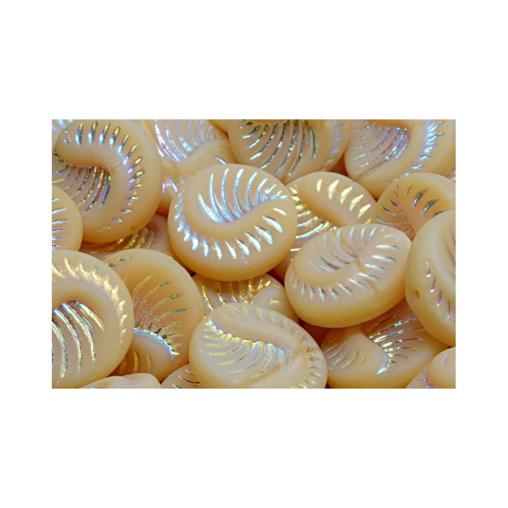 Pale beige tones meet a delicate rainbow shimmer in these hand-pressed Fossil Coin Beads 19 x 19 mm. The opaque cream base provides a neutral foundation, while the intricate spiral etchings are highlighted with an iridescent luster that shifts in the light. These beads capture the essence of ancient maritime treasures, making them a sophisticated choice for nature-inspired collections.