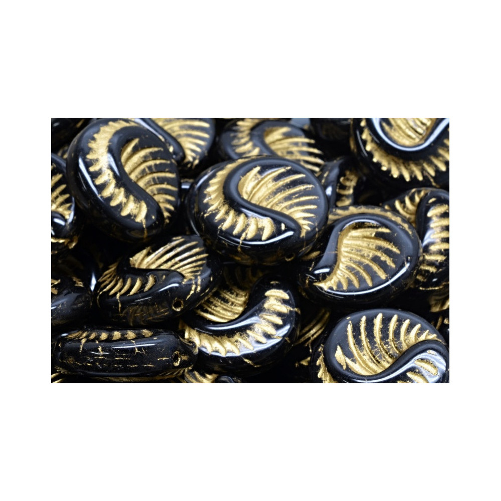 Bold statement earrings featuring a single Fossil Coin Beads 19 x 19 mm dangle will immediately capture attention with their prehistoric swirl texture and rich contrast. These handmade Czech glass components serve as perfect focal beads for asymmetrical designs or centerpieces in elaborate necklaces. The glossy black opaque base provides a dramatic backdrop for the gold painted detailing, which highlights the intricate organic pattern reminiscent of ancient ammonites and maritime fossils.