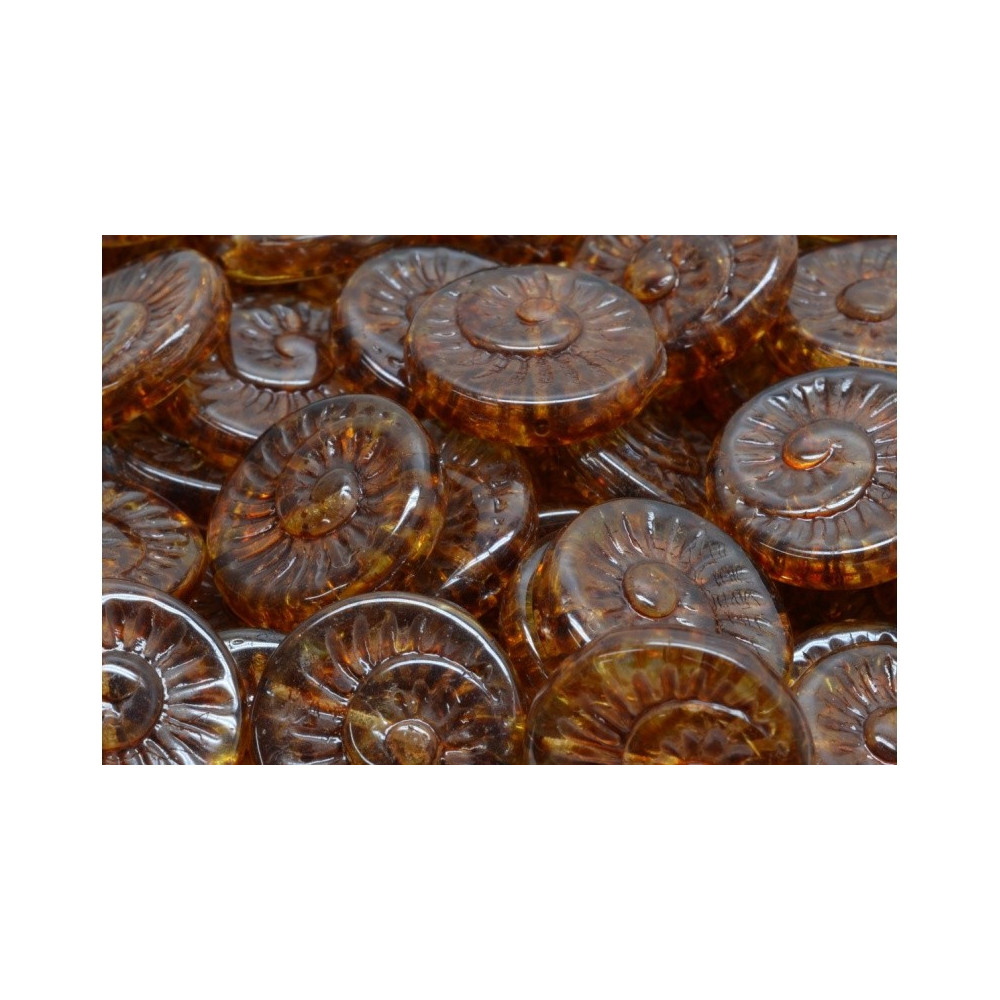 Earthy honey tones and intricate textures define these Fossil Shell Beads 18 x 18 mm. Hand-pressed in the Rutkovsky family workshop, each piece captures the timeless beauty of ancient ammonites. The warm Crystal Travertine finish adds a rustic, aged character that perfectly complements natural materials like leather or linen. These pressed glass beads are essential for designers seeking a balance between historical inspiration and modern style.