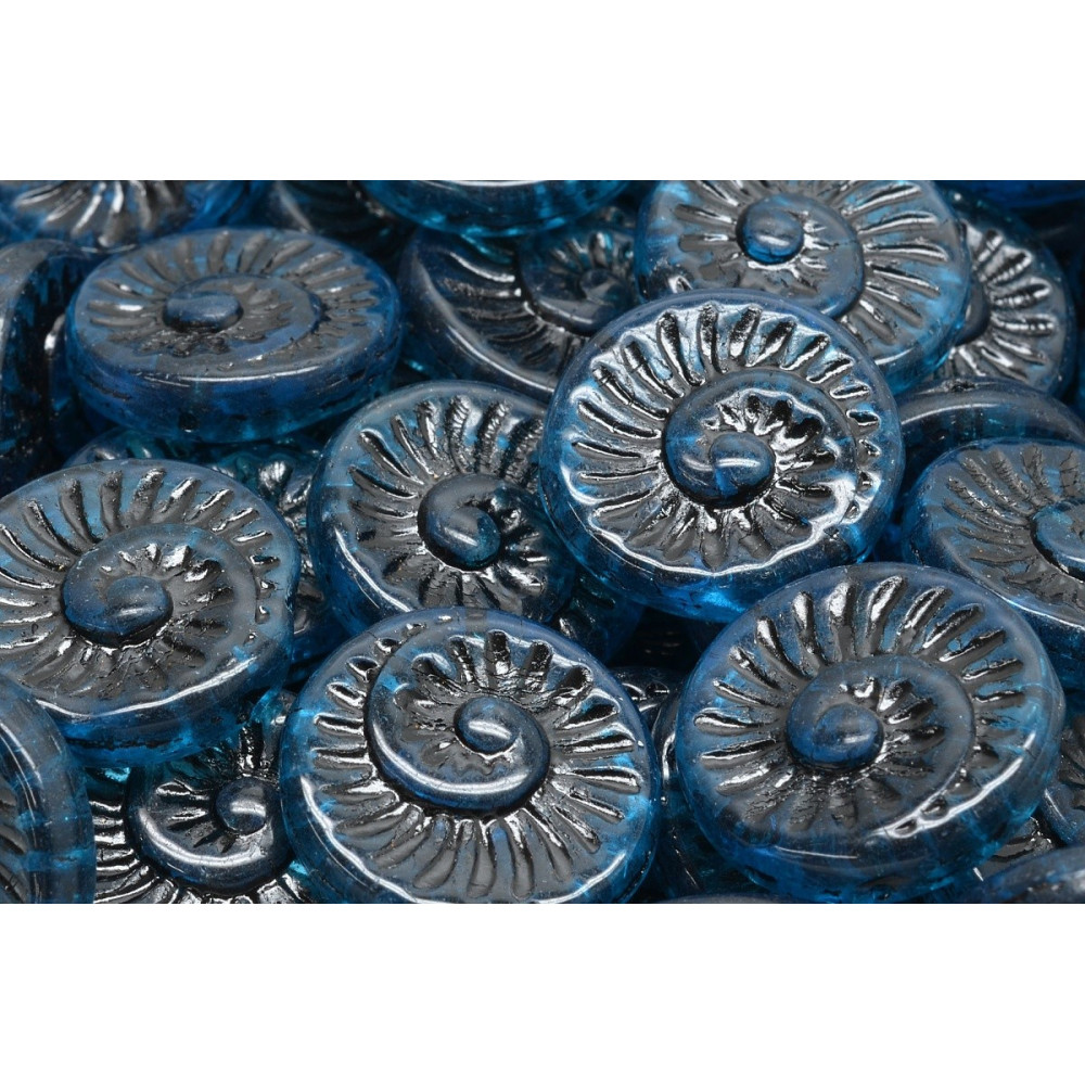 Deep teal hues meet ancient textures in these stunning ammonite-inspired glass pieces. These Fossil Shell Beads 18 x 18 mm are meticulously produced using traditional Czech glassmaking heritage, ensuring that every swirl and ridge captures the essence of a natural sea fossil. The vibrant Dark Aquamarine color is enhanced by a dark wash, which settles into the crevices to accentuate the intricate spiral design.