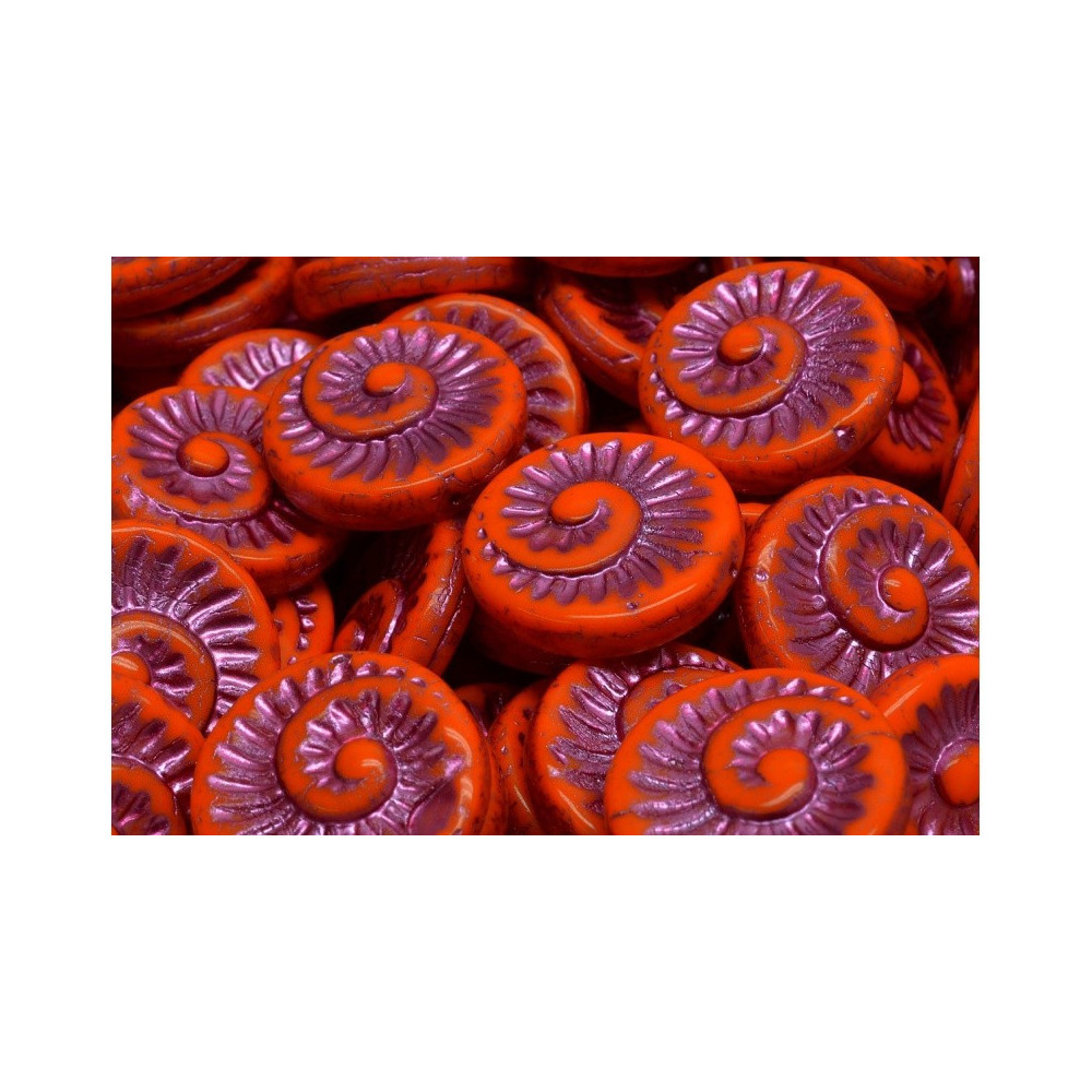 Vibrant orange hues meet a delicate metallic pink wash in these exquisite Fossil Shell Beads 18 x 18 mm. Each piece is meticulously hand-pressed using traditional molds by the Rutkovsky family, ensuring a level of detail that captures the timeless beauty of ancient ammonites. The swirling spiral pattern is highlighted by a shimmering finish that catches the light, making these handmade Czech glass components a mesmerizing focal point for any bohemian-inspired necklace or statement earrings.