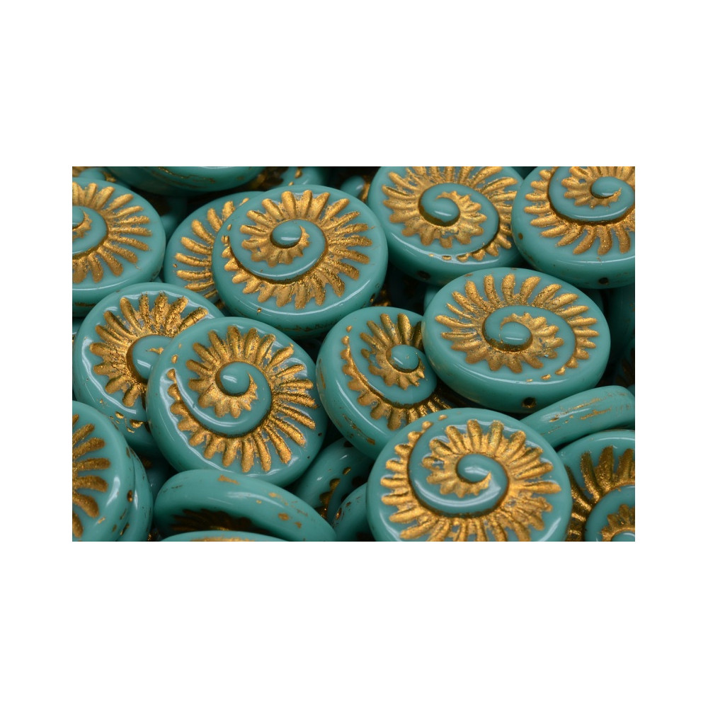 Turquoise and gold hues combine in these striking Fossil Shell Beads 18 x 18 mm, which are meticulously hand-pressed by the renowned Rutkovsky family in the heart of the Jizera Mountains. Each piece features a detailed spiral ammonite motif, capturing the timeless beauty of ancient marine life in high-quality handmade Czech glass. The intricate relief work demonstrates the precision of traditional glassmaking heritage.