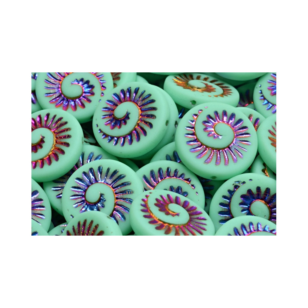 Mint green tones meet a mesmerizing metallic spiral in these unique Fossil Shell Beads 18 x 18 mm. I have found that the matte finish of the Czech glass provides a sophisticated contrast to the iridescent sheen tucked within the embossed pattern. They look just like tiny ancient treasures discovered on a turquoise shore, making them a perfect focal point for any handmade jewelry project.