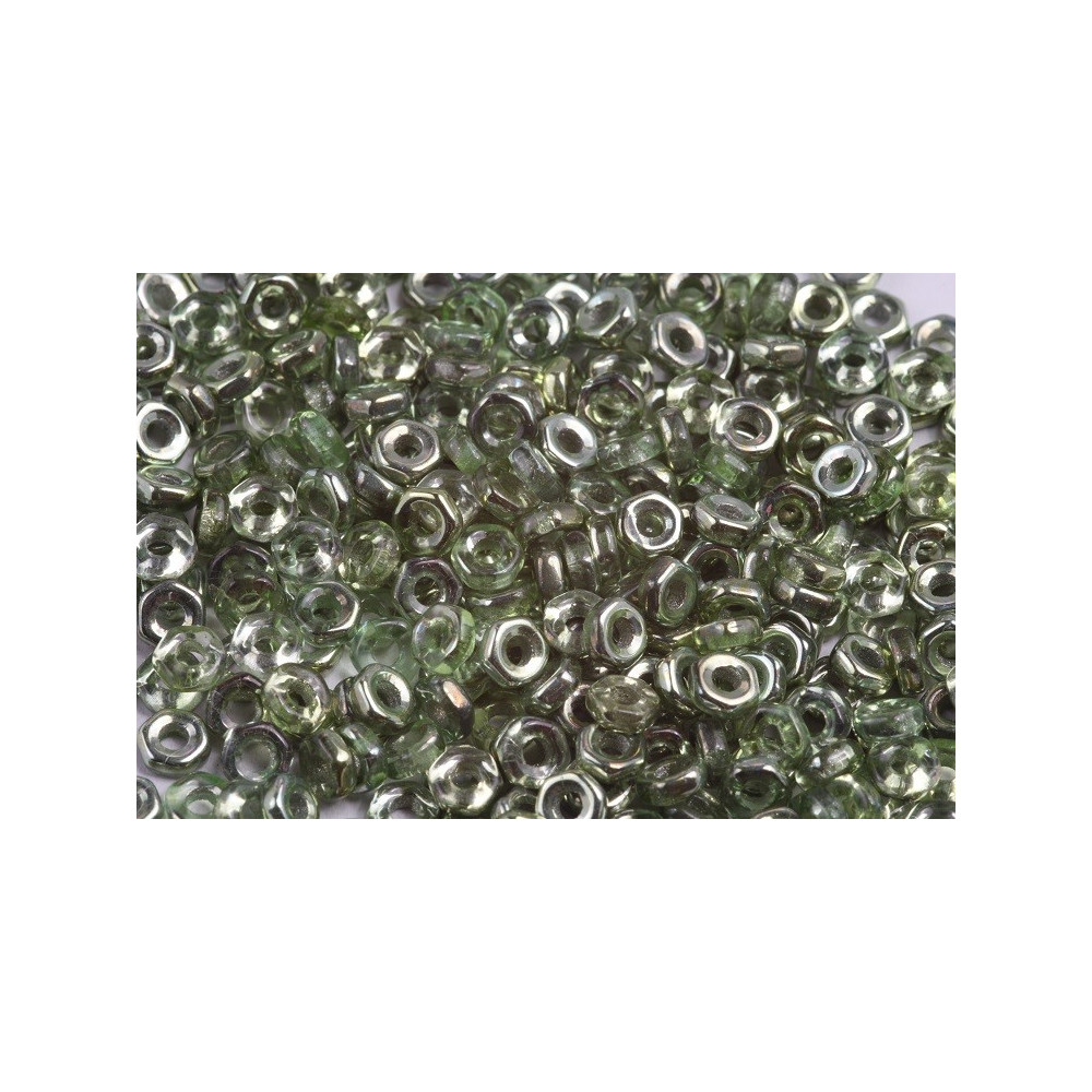 Luster finishes on transparent glass cores provide a subtle depth that shifts under different lighting environments. This specific green-silver coating is highly durable, designed to maintain its brilliance throughout the life of the handmade jewelry. When paired with Preciosa seed beads in size 8/0 or 11/0, these Hex Nut Beads 2 x 5 mm act as stabilizing anchors that improve the drape and structure of necklaces and bracelets. The metallic sheen perfectly complements both silver and gunmetal findings for a cohesive aesthetic.