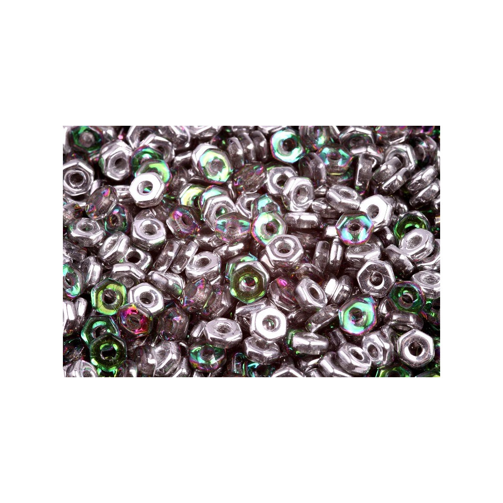 Metallic silver and vibrant rainbow flashes define these Hex Nut Beads 2 x 5 mm, offering an industrial-chic aesthetic that stands out from standard round spacers. While traditional seed beads provide a soft flow, these geometric glass beads introduce a structured, mechanical edge to contemporary designs. The iridescent finish reacts beautifully to light, shifting between emerald, violet, and magenta tones against a cool metallic base, providing a dynamic look that changes with every movement.