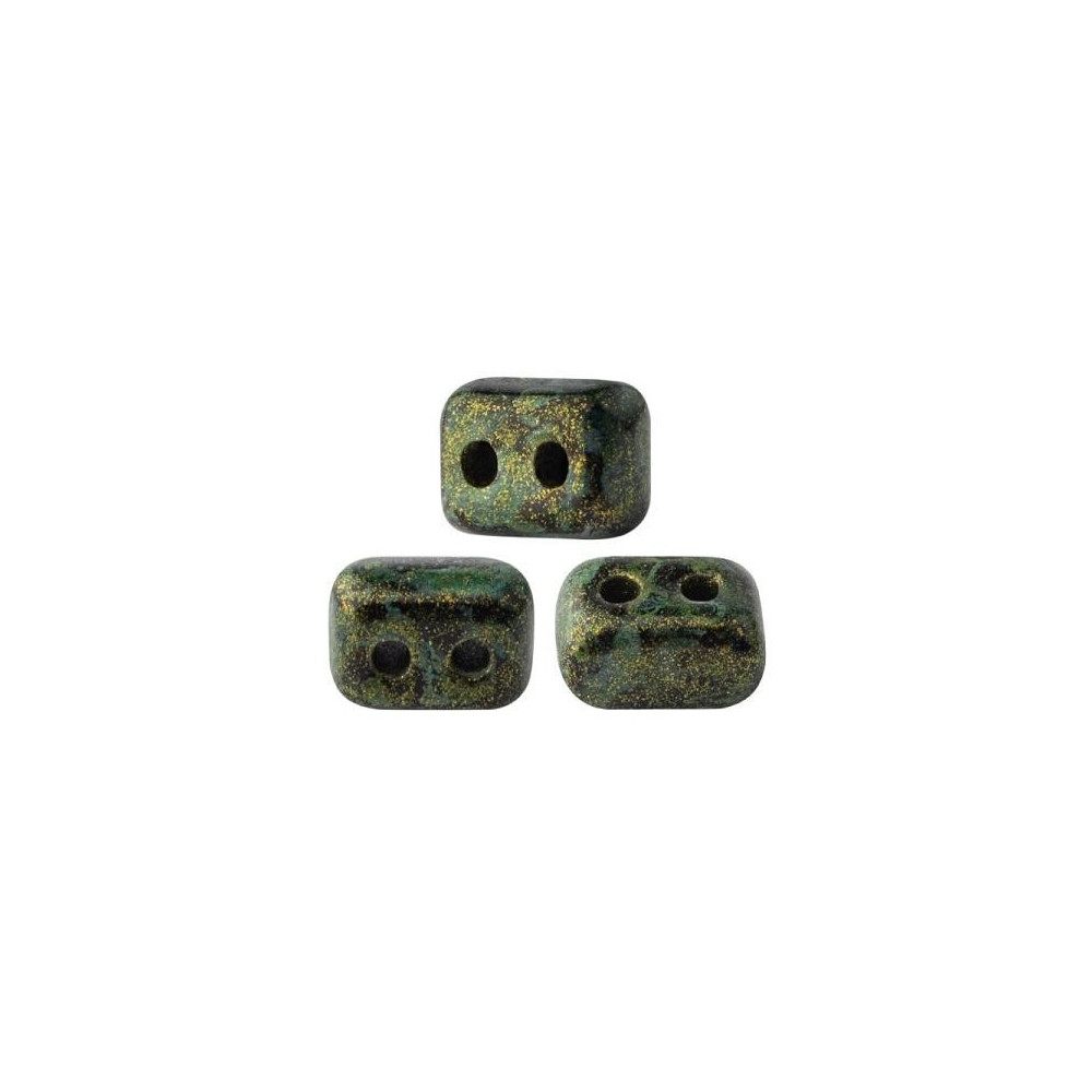 Lush peridot green tones meet a textured, antique finish in these unique rectangular components. Imagine a structural necklace where these two-hole beads form a rigid, golden-flecked spine, offering both stability and a sophisticated matte glow. These Czech glass beads are masterfully crafted to provide a spotted effect that mimics oxidized metal or mossy stone, perfect for designers looking to add an organic, earthy touch to their geometric jewelry making projects. The dual-hole design allows for incredible precision, ensuring your patterns remain flat and professional.