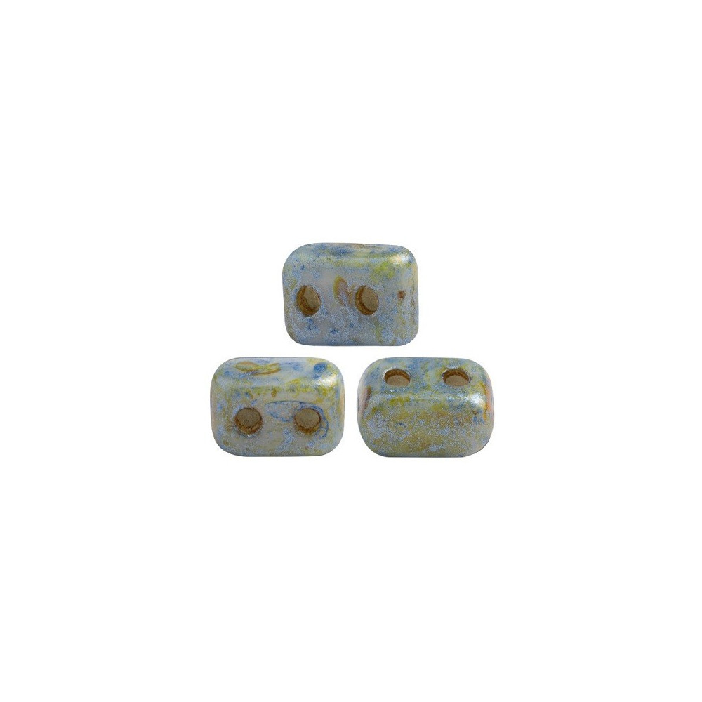 Two-hole pressed Ios® par Puca® beads 2.5x5.5mm OPAQUE BLUE/GREEN SPOTTED 02010/65325