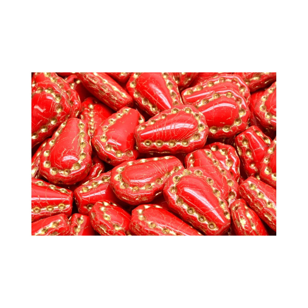 Unlock the potential of your beadwork with Rutkovský's Lacy Tear Beads in opaque coral red and gold. Their intricate design and luxurious color make them a must-have for any serious crafter or jewelry designer. Order yours today and bring a touch of elegance to your projects!