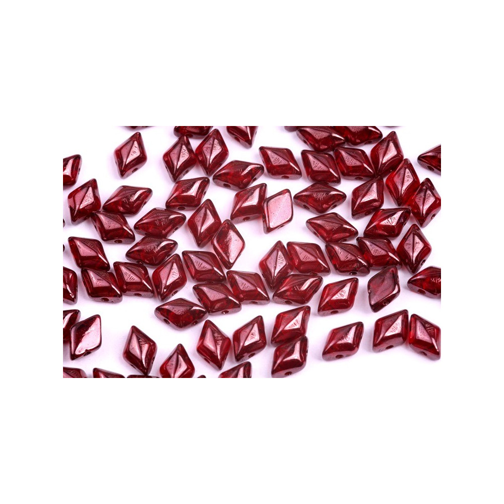 Premium Matubo GemDuo beads in a rich ruby red with a lustrous Vega finish. These diamond-shaped Czech glass beads feature two parallel holes, making them an essential component for structural jewelry making and advanced bead weaving patterns.