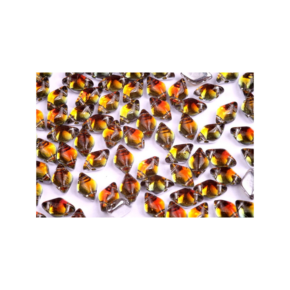 Vibrant amber glows from the heart of these diamond-shaped components, mimicking the warm, liquid hues of a desert sunset. These Matubo GemDuo beads feature a specialized backlit finish that creates a captivating contrast between the smoky, dark edges and the radiant honey-colored center. When integrated into a statement necklace or bracelet, the raised facets catch the light from every angle, providing a sense of depth and movement that elevates any jewelry project from simple to professional.