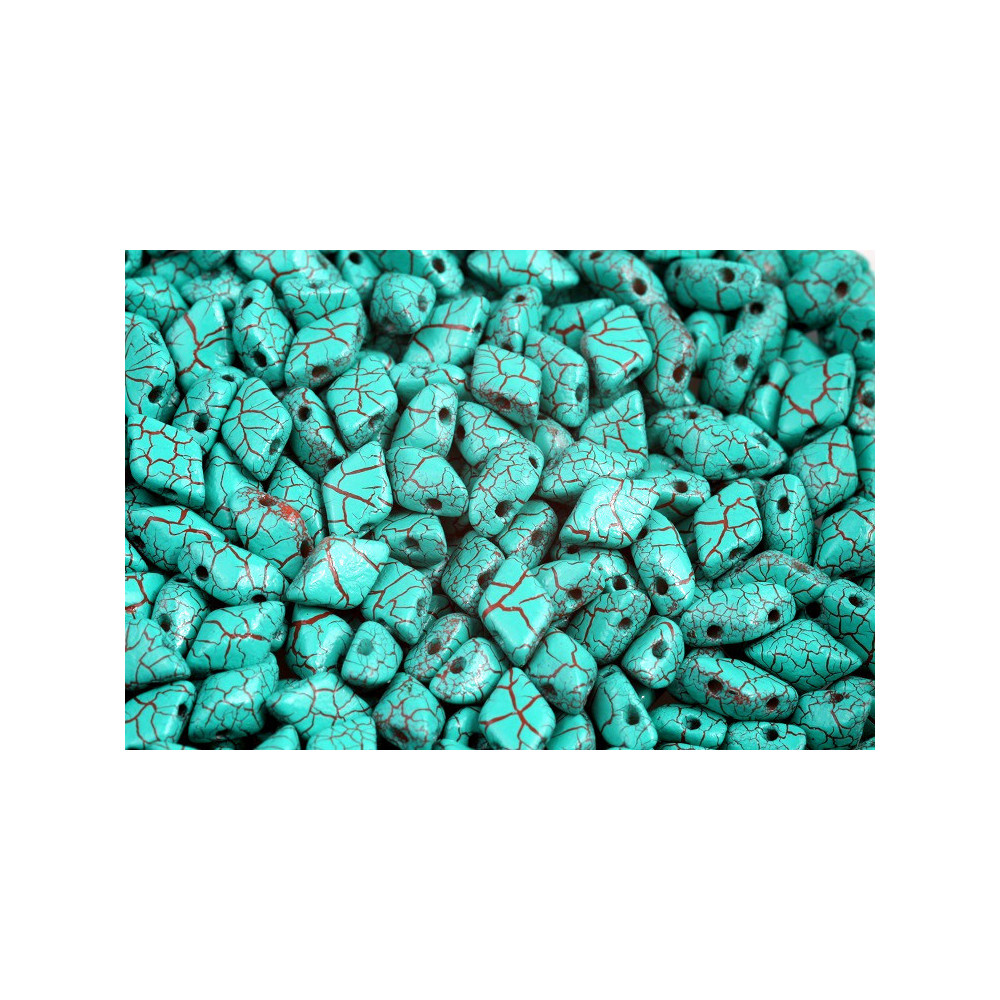 Ionic Turquoise Green/Brown presents a sophisticated mottled finish, where a vibrant aqua core is intersected by earthy, rust-colored veins reminiscent of natural turquoise stone. These Matubo SuperDuo beads alternatives provide a flat back and a sharp, angled top, allowing them to nestle perfectly into tessellating patterns. The unique surface treatment ensures that no two beads are identical, providing an organic, artisan feel to high-end jewelry pieces.