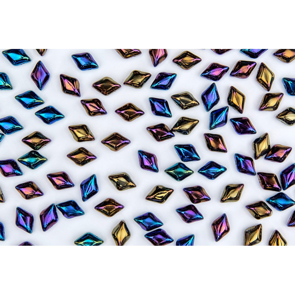 Metallic luster and deep oil-slick reflections define these precision-cut diamond shapes, making them a centerpiece for contemporary jewelry design. By incorporating Matubo MiniGemDuo beads into your work, you can create intricate transitions in scale and sophisticated 3D textures that elevate standard bead weaving projects. For best results, use S-lon FIRE thread due to its superior abrasion resistance when performing multiple thread passes through the bead with beading needles size 10-11. These high-quality Matubo beads feature a flat back and a sharp, faceted top that catches the light brilliantly in every celestial-inspired pattern.