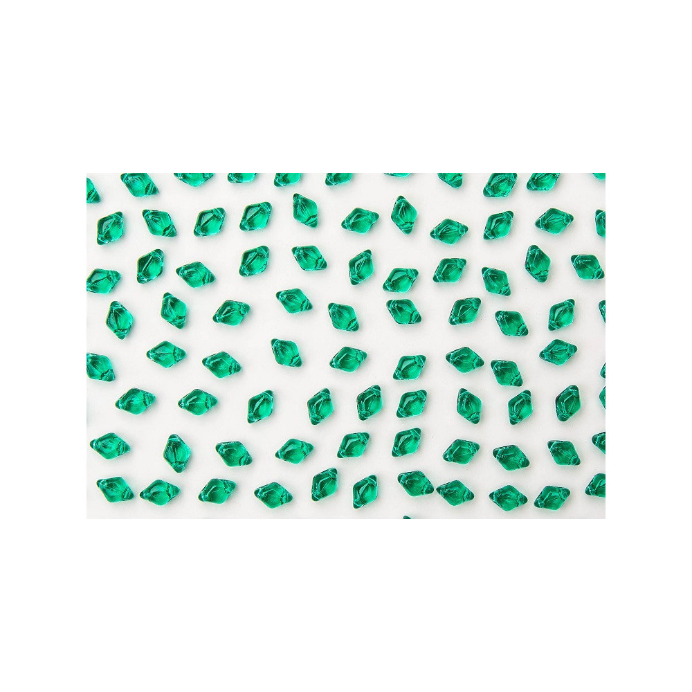Emerald green 6 x 4mm diamond-shaped beads represent a pinnacle of precision in Czech glass manufacturing, offering a compact 2-hole geometry that ensures a seamless fit in complex bead weaving designs. Developed by Matubo™, these MiniGemDuo components feature a generous 0.8mm hole diameter, allowing for multiple thread passes through the bead with a classic beading needle size 10 or 12. The consistent hole alignment is critical for structural integrity when you combine them with larger Matubo GemDuo beads to create textured, high-relief jewelry patterns.